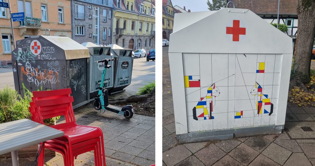 Seit einigen Wochen verschönern Katzen-Bilder à la Mondrian den Rote-Kreuz-Container an der Ecke Gebhardt-/Breite Straße. Wir sprachen mit ihnen: