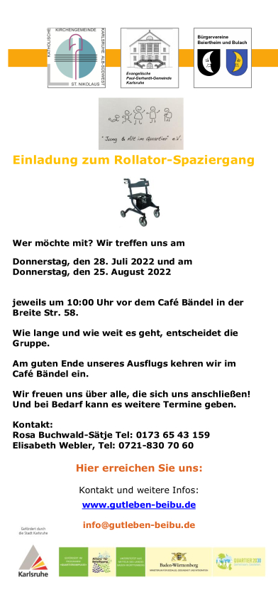 « Alle Veranstaltungen Diese Veranstaltung hat bereits stattgefunden. Einladung zum Rollator-Spaziergang 25. August 2022 , 10:00 - 11:00 « Die Honigbiene lädt zum Besuch ein Einladung zur 6. Zukunfts-Werkstatt » Zum Kalender hinzufügen Google Kalender iCalendar Outlook 365 Outlook Live Details Datum: 25. August 2022 Zeit: 10:00 - 11:00 Veranstaltungskategorie: Beiertheim Veranstaltungsort Café Bändel Breite Straße 58 Karlsruhe, 76135 Deutschland Google Karte anzeigen