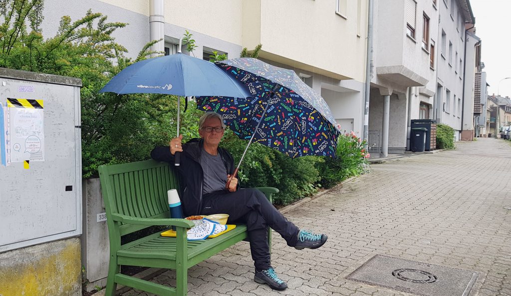 Der Tag begrüßte uns wolkenverhangen, und schon beim Aufstehen war klar, dass das Wetter heute eine eigene Agenda hatte. Mit kreativen Ideen, sich vor dem Regen zu schützen, setzten sich die Mutigen an die Straße. Unter einer Markise, Regenschirmen oder einem Partyzelt, harrten wir aus, und kamen ins Gespräch, mit denen, die sich dazu gesellten.